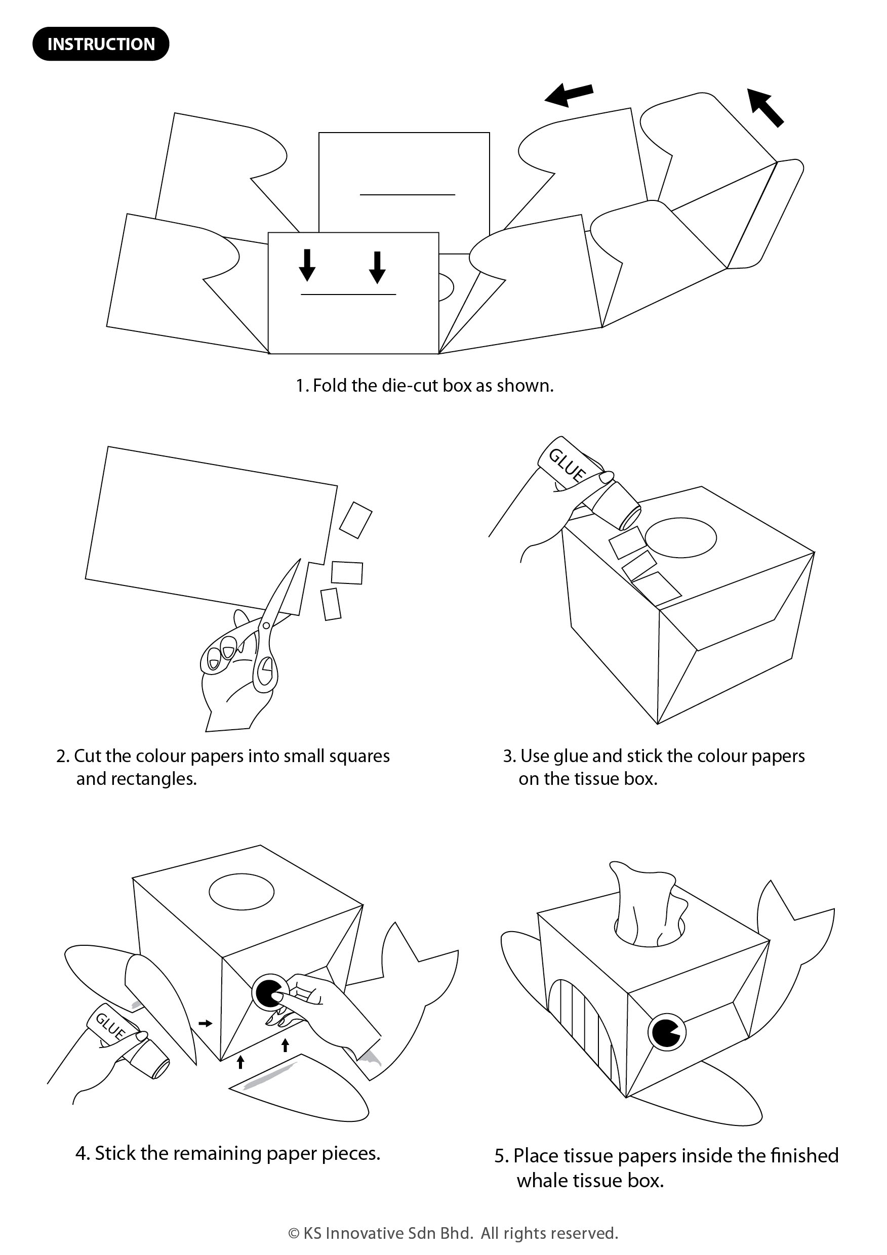 Bright and cute DIY Lion and Whale tissue box cheers up any room while staying functional! Easy to construct, kids will love the cutting, gluing and pasting process. The tissue box is made from artcard material and is pre-cut, kids just have to fold according to instruction.