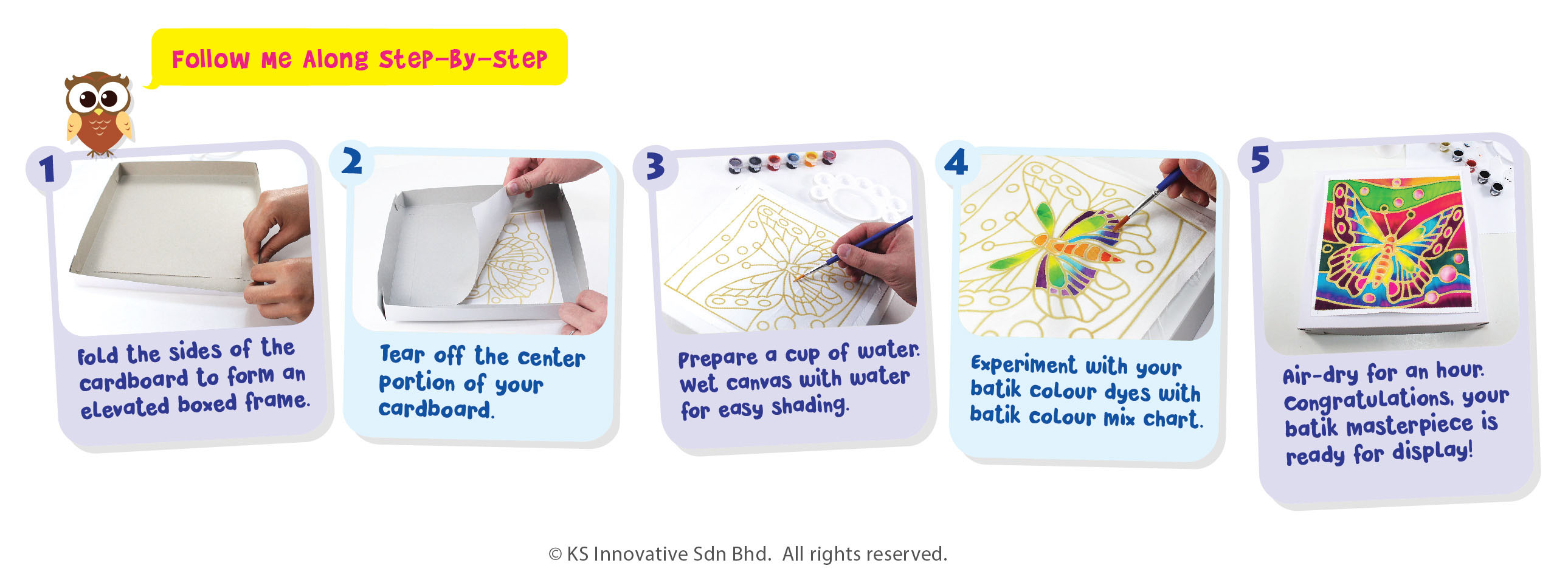 The batik canvases are square sized at 8" x 8" (21cm x 21cm), individually mounted on cardboard frame that also acts as an elevated painting surface.