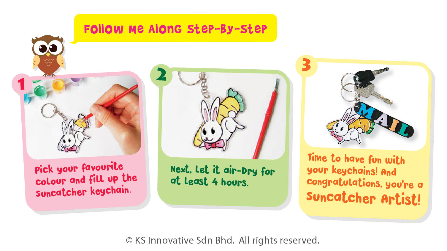 One of our bestseller crafts, suncatcher keychain painting kit provides 2 assorted cartoon designs and complete with colouring tools. Kids only have to mix and fill in colours that they like, creating beautiful masterpieces. Let the sun rays shine through the finished transparent craft!