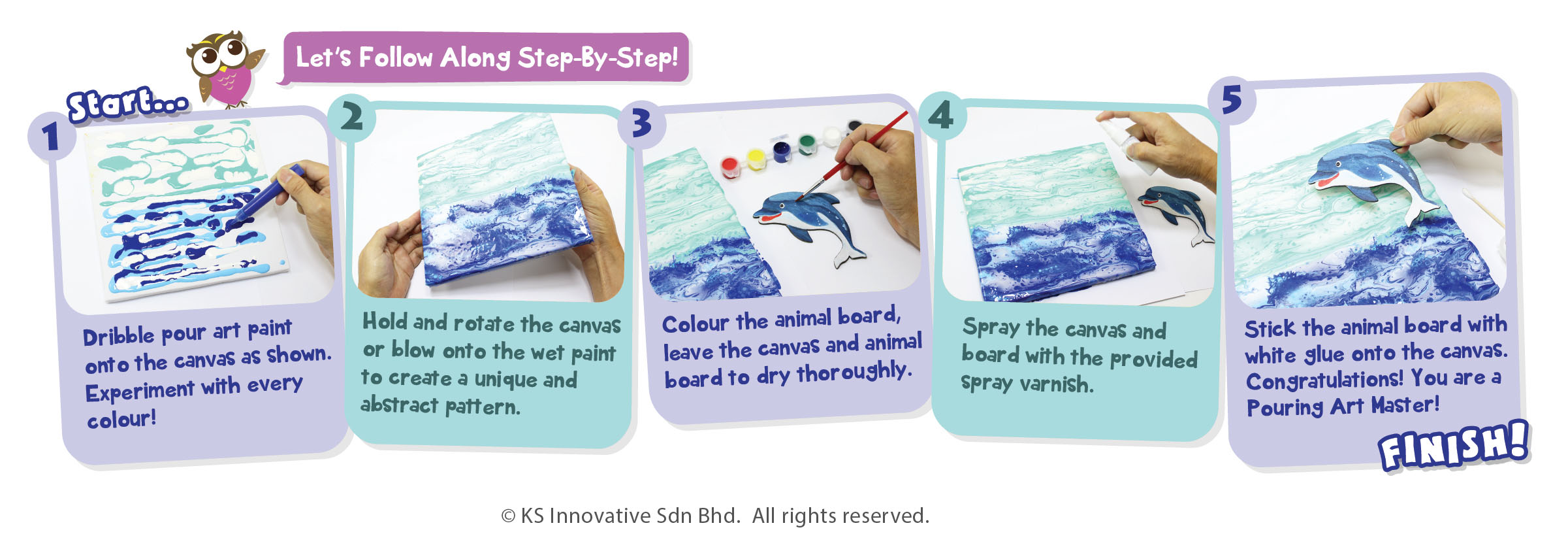 Learn to create the art of paint pouring on canvas - creatively pour and mix paints to design a multi-colour, abstract, marble-effect painting! Rotate, swirl, poke and blow on the paint as they blend together! Add Turtle and Shark boards on top of each canvas for a cute finish. Hang them up to show off your Pour Art masterpieces. The kit has everything ready, only creativity from you is needed!