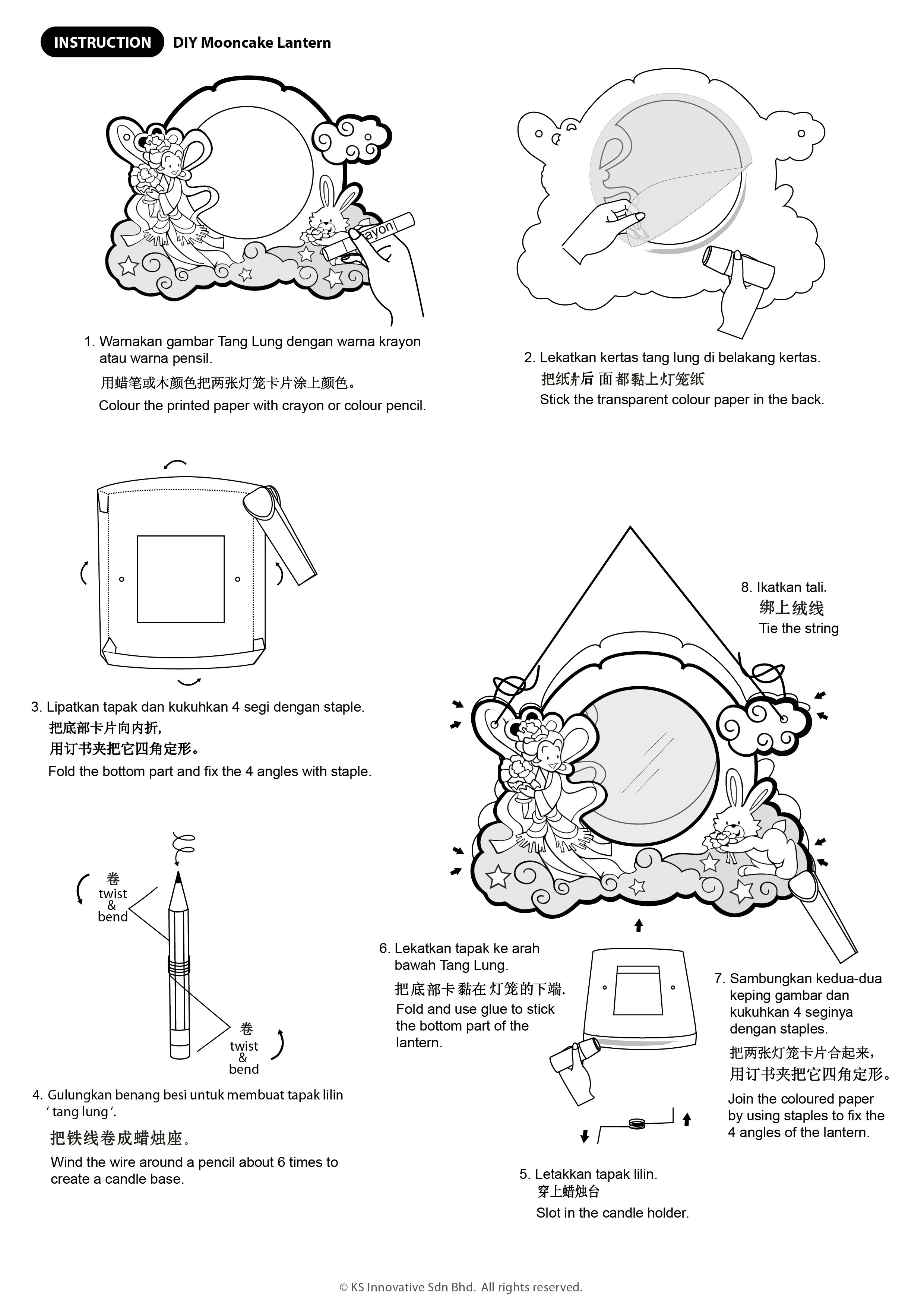 Lit up and celebrate Mid-Autumn festival with this DIY lantern colouring project in cute Rabbit and Moon Princess/Fairy theme! In Chinese fairytales, the Moon Princess/Fairy lives on the moon with Jade Rabbit. Learn about their story whilst colouring the characters! You may use colour pencils, crayons or marker pens. The black outline is printed on easy-to-colour quality paper that has been pre-cut.
