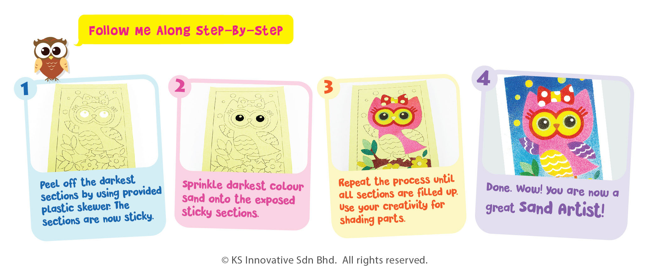 Hoot owl hoot in our Barn Owls Sand Art! Our 5-in-1 Creative Sand Art series are designed in single-lined style where kids just have to peel and sprinkle, no scissors required! Keep completed sand art card neatly in plastic sleeve.