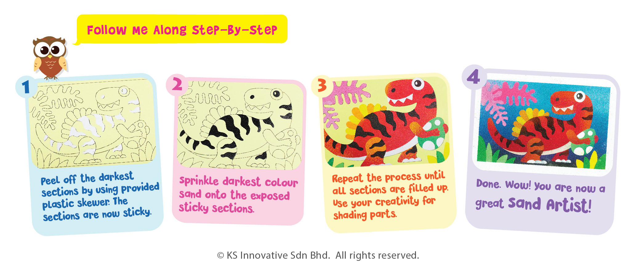 Educate your kids to our Dino World Sand Art! Our 5-in-1 Creative Sand Art series are designed in single-lined style where kids just have to peel and sprinkle, no scissors required! Keep completed sand art card neatly in plastic sleeve.