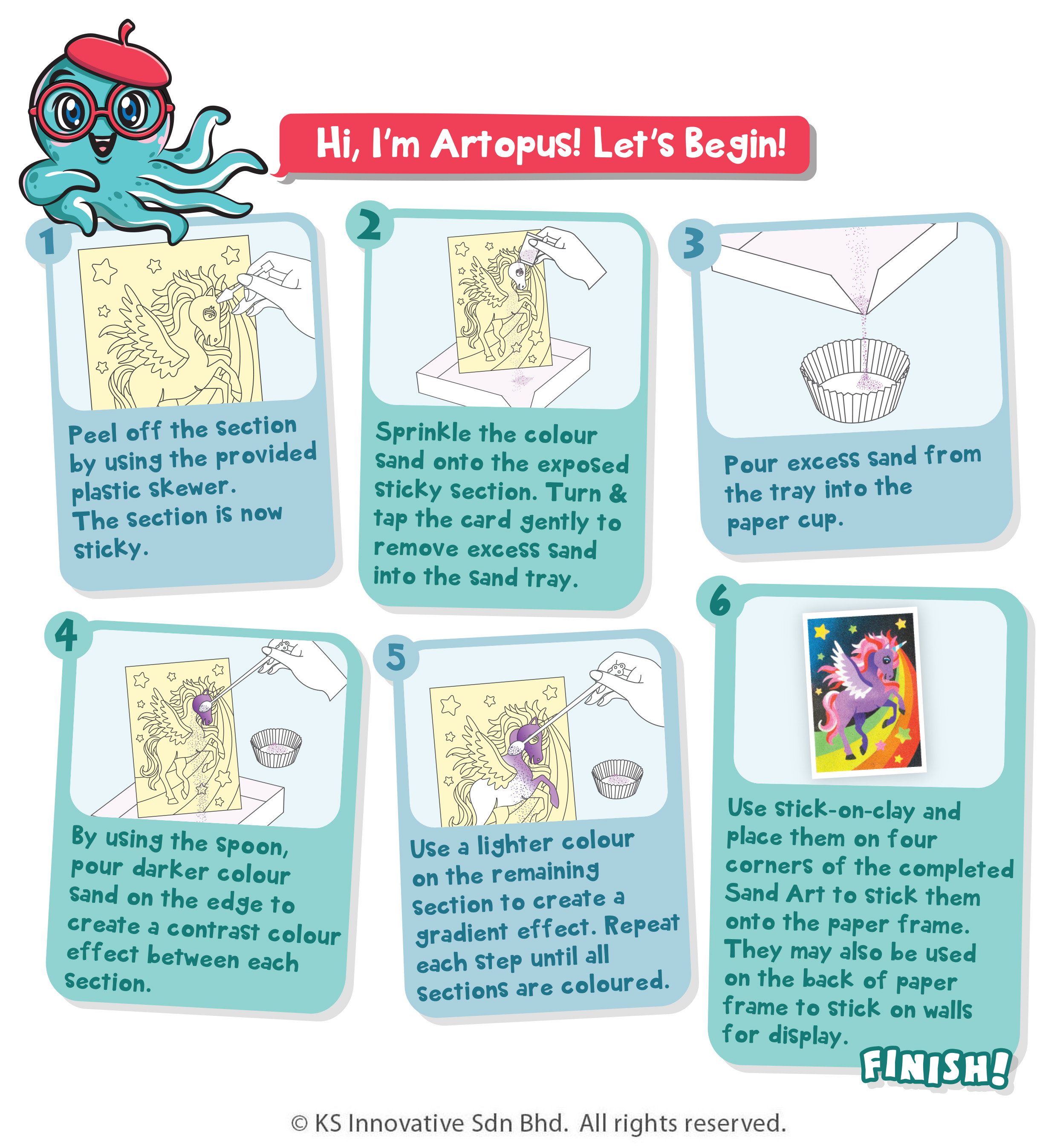 Launch into the Sand Art world of creativity in 4 different and awesome themes: Fantasy Unicorns, Beautiful Butterflies, Enchanting Princesses and Amazing Dinosaurs! All of which are designed by our in-house Sand Art Designer with an eye for detail and imaginary fun! Our 3-in-1 Creative Sand Art series are designed in single-lined style where kids just have to peel and sprinkle, no scissors required! Display your Sand Art masterpiece in our provided Sand Art paper frame!