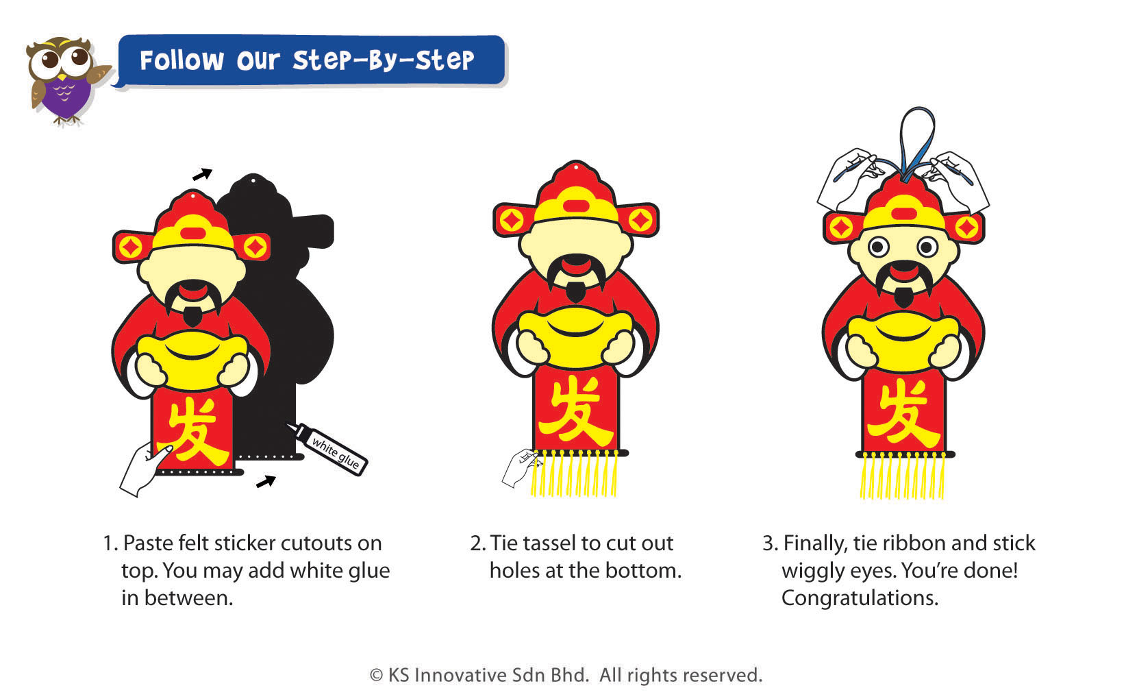 Usher in and celebrate luck and prosperity this Chinese New Year with a do-it-yourself felt wall deco! This kit has Fortune God and Lion Dance design to spruce up your wall. Kids only have to stick felt and wiggly eyes according to design, then use their motor skill to tie up each string of the tassel through the holes. Then tie up with ribbon at the top to hang it up!