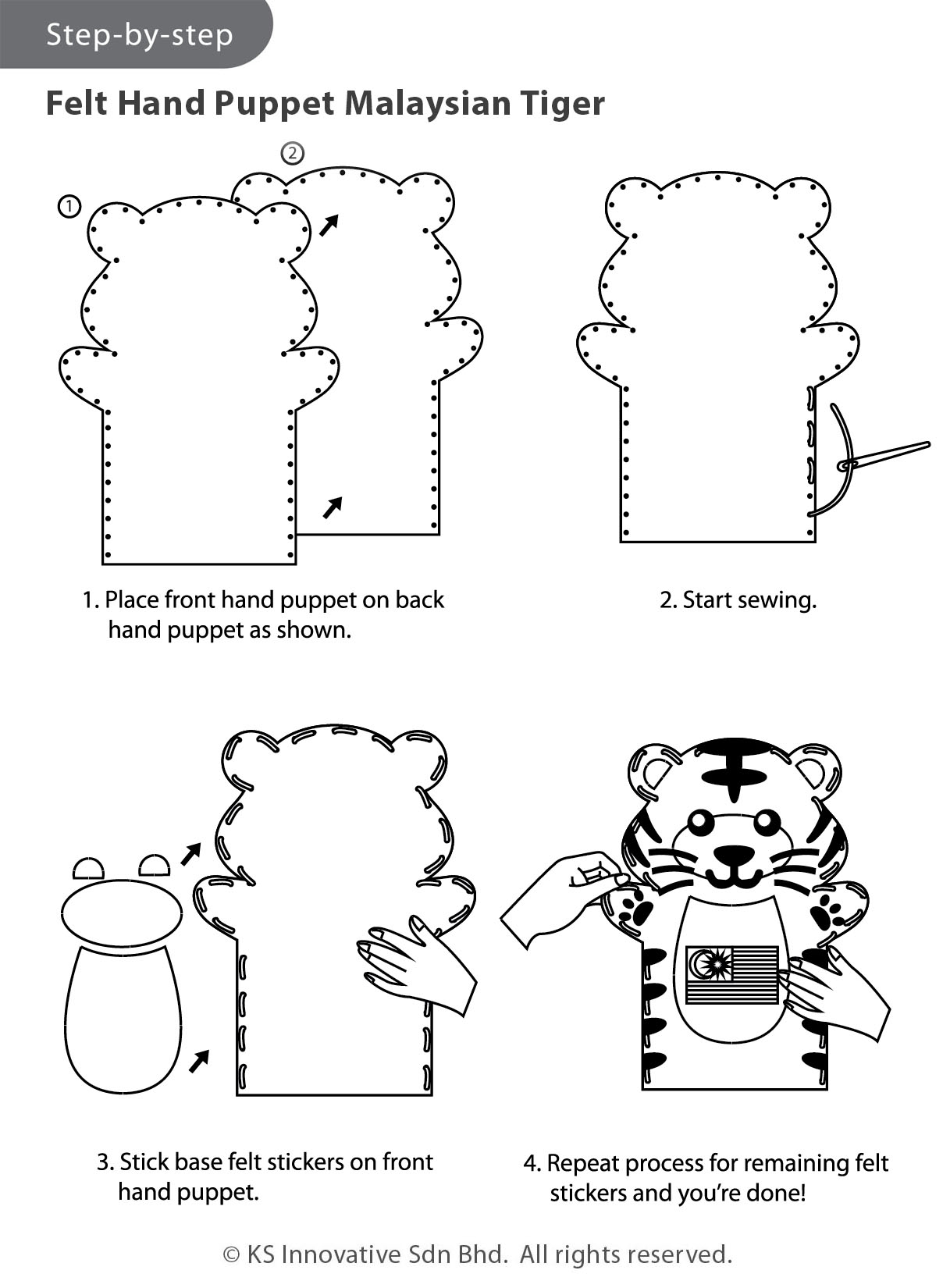 Create an adorable Malaysian Tiger hand puppet and put on a show to engage interactive play with friends and families! Get into the creative process by sewing the Tiger hand puppet with a child-safe needle, and afterwards by also using their fine motor skills and hand-eye coordination, stick felt stickers as a final touch. Enhance your story-telling by using your very own Malaysian Tiger hand puppet!