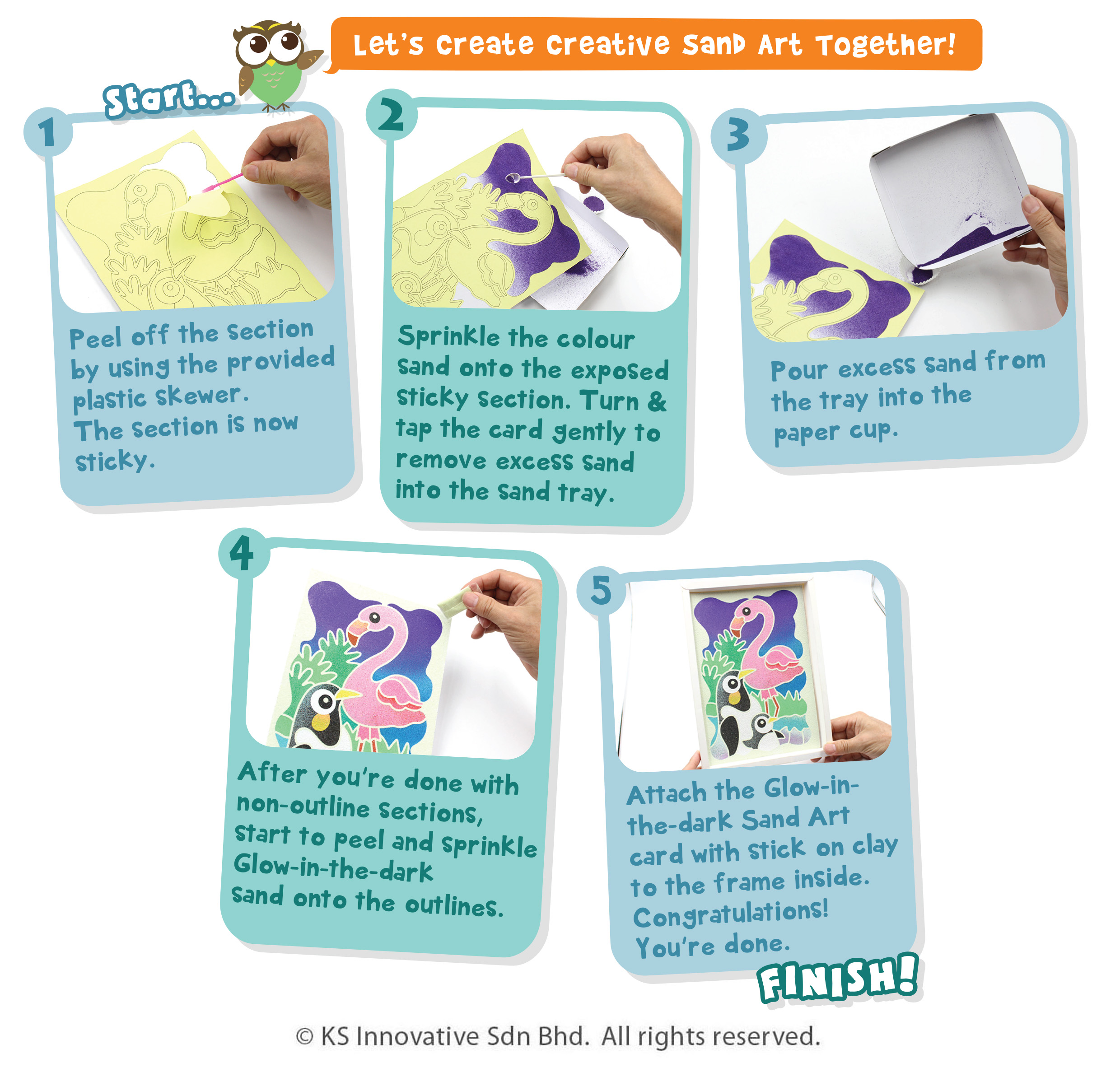 Turn the lights off and mesmerize upon the captivating and magical Glow-in-the-Dark Sand Art Series! This illuminating craft combines the aesthetics of Sand Art with the magic of luminescence, creating stunning visual displays using sand that glows in the dark and comes in 4 different themes: Unicorns, Birds, Animals and Dinosaurs. All of which are designed by our in-house Sand Art Designer with an eye for detail and imaginary fun! Our 3-in-1 Glow-in-the-Dark Sand Art series is a unique and enchanting creative work that's also fun and easy to make! Kids just have to peel and sprinkle, no scissors required! Let sun and lights shine on it for maximum effect in a dark room and display your Glow-in-the-Dark Sand Art masterpiece in our provided Sand Art paper frame!