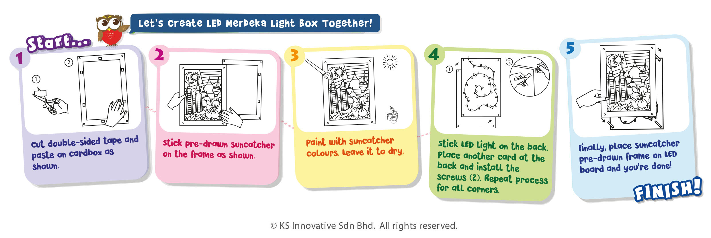 Our colourful LED Merdeka suncatcher light box kit will definitely lift up everyone's Merdeka spirit and national pride in all of us! The beautiful Malaysian theme is absolutely great to colour in with your favourite suncatcher colour paints, also included in this kit. Merdeka or National Day teaches us the importance of our beloved country's independence and this craft is perfect for it. Kids will love painting the suncatcher and constructing the LED light box (with adult supervision), seeing the blinking lights go off at the end of the activity!