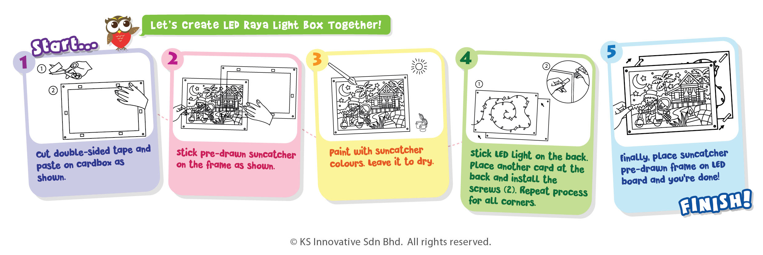 Brighten and sparkle up the atmosphere in this festive Hari Raya season with colourful LED Raya suncatcher light box kit! The adorable "Balik Kampung" Going Back Hometown design is absolutely great to colour in with your favourite suncatcher colour paints, also included in this kit. Hari Raya teaches us the significance of coming together as a family to celebrate this auspicious occasion and this craft is perfect for it. Kids will love painting the suncatcher and constructing the LED light box (with adult supervision), seeing the blinking lights go off at the end of the activity!