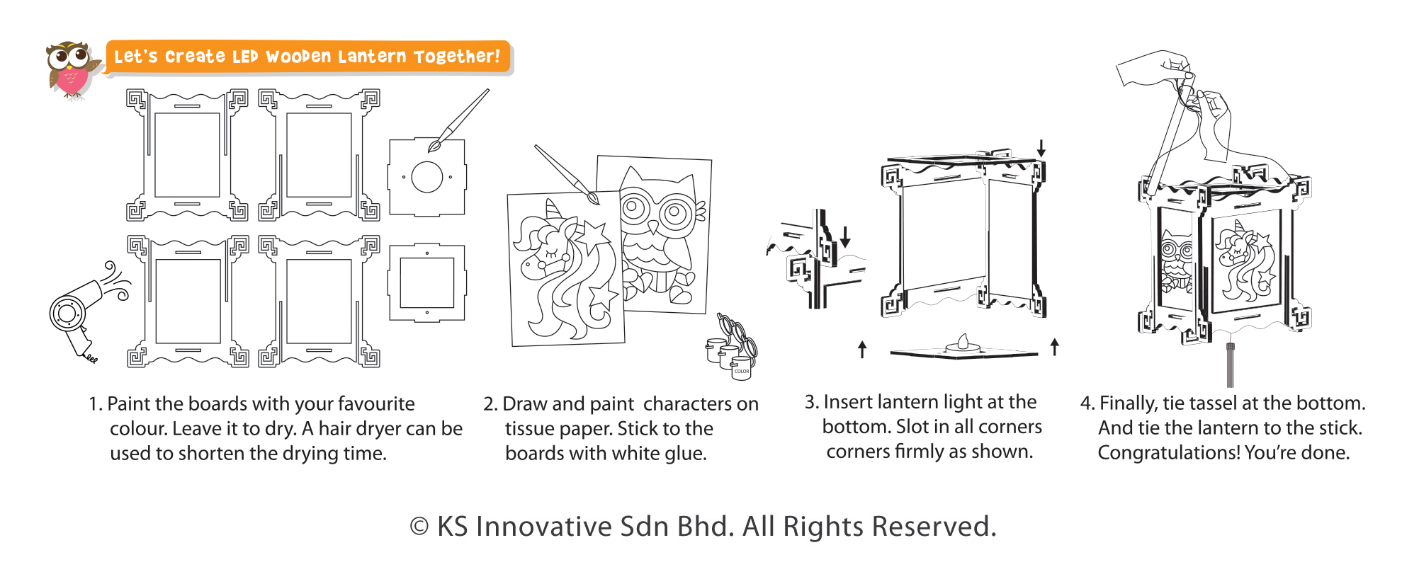 Bring in the light during the night with this beautiful DIY Owl and Unicorn lantern! You can colour them as you like and decorate around the house or bring-it-along for Mid-Autumn Festival. Just illuminate the lantern's Owl and Unicorn with a safe LED light that comes with it. The lantern has 4 sides and each side alternates between the Owl and the Unicorn!
