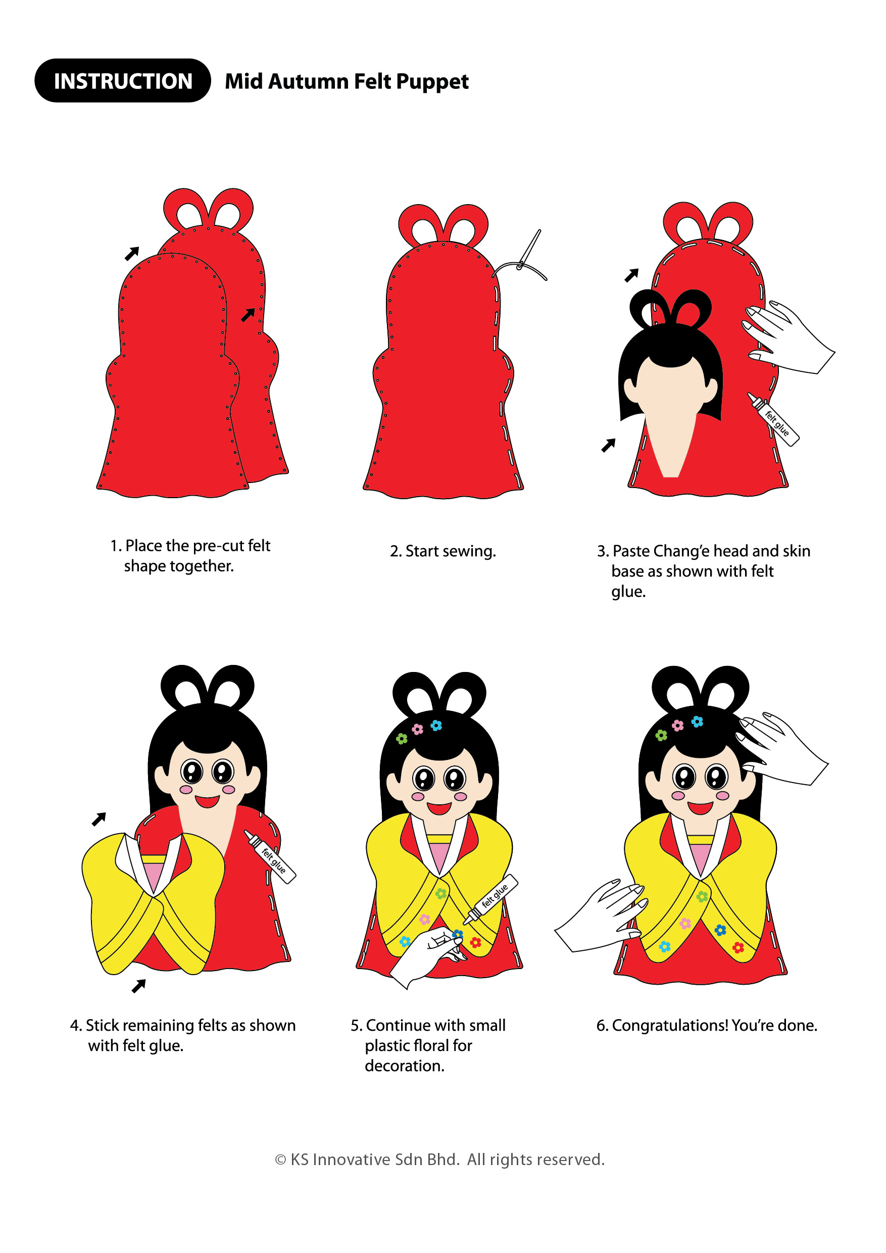 Enhance a child's Mid-Autumn story-telling and performing by creating their Moon Princess and Rabbit hand puppets! Get into the creative process by sewing the beautiful hand puppets with a child-safe needle, and afterwards by also using their fine motor skills and hand-eye coordination, stick felt stickers as a final touch. Amazing play for the solo performer or better yet, a group storytelling to fill up a fun and imaginative day!