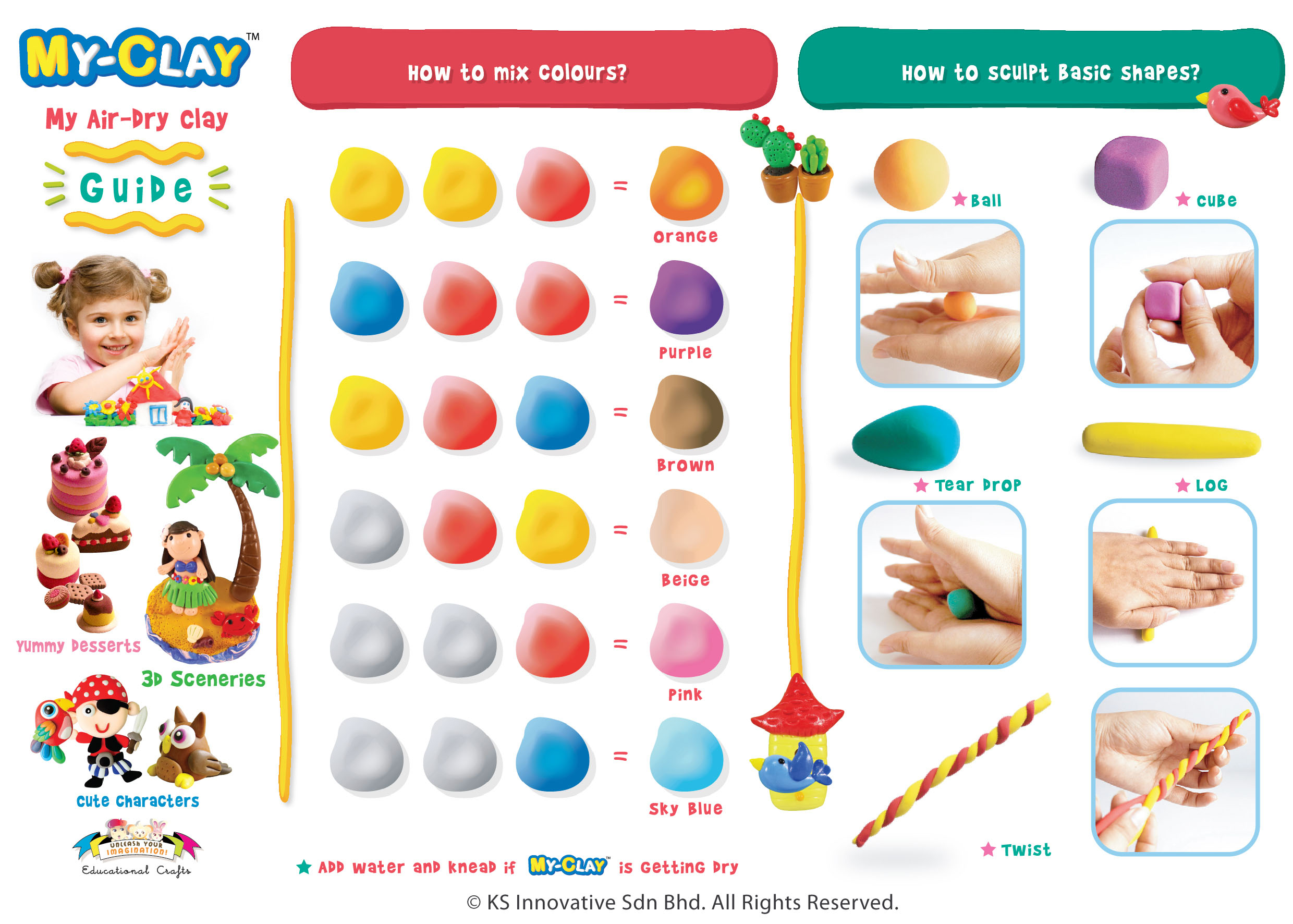 Our instruction sheet displays basic clay-sculpting techniques. My-Clay is a lightweight, air-dry clay made specially for kids' craft. The kids will adore rolling, squeezing, twirling, and pulling My-Clay into 3D shapes.