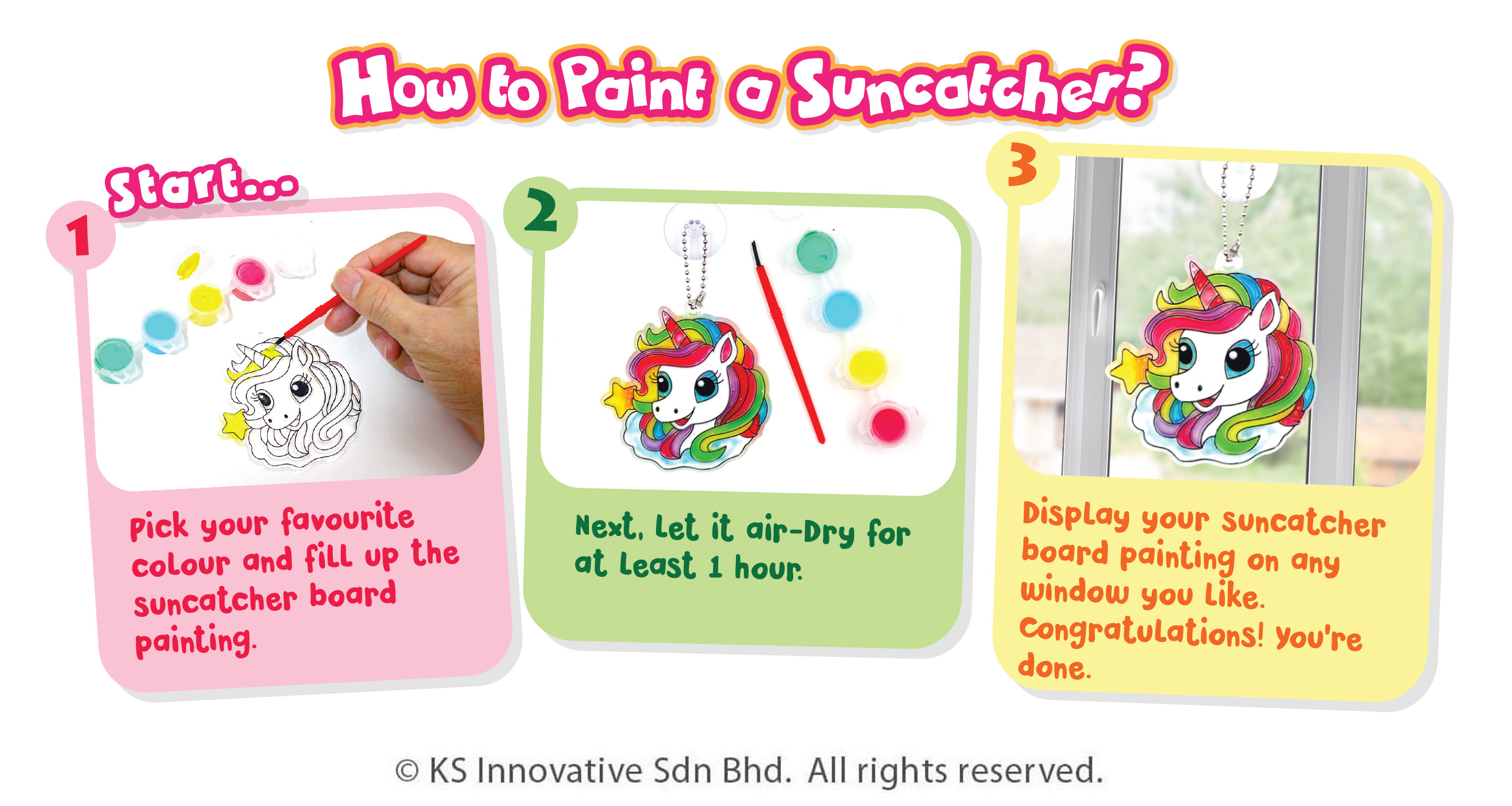 Catch sunlight with our new Suncatcher Board Deco's vibrant colours! The kit includes 2 intricate Suncatcher designs packed randomly. Suncatchers can enhance the ambiance of any room, bringing a touch of elegance and charm. Kids only have to mix and fill in colours that they like, creating beautiful masterpieces. Let the sun rays shine through the finished transparent craft! You may stick the suction on any smooth surfaces such as tiles, car window or glass panel.