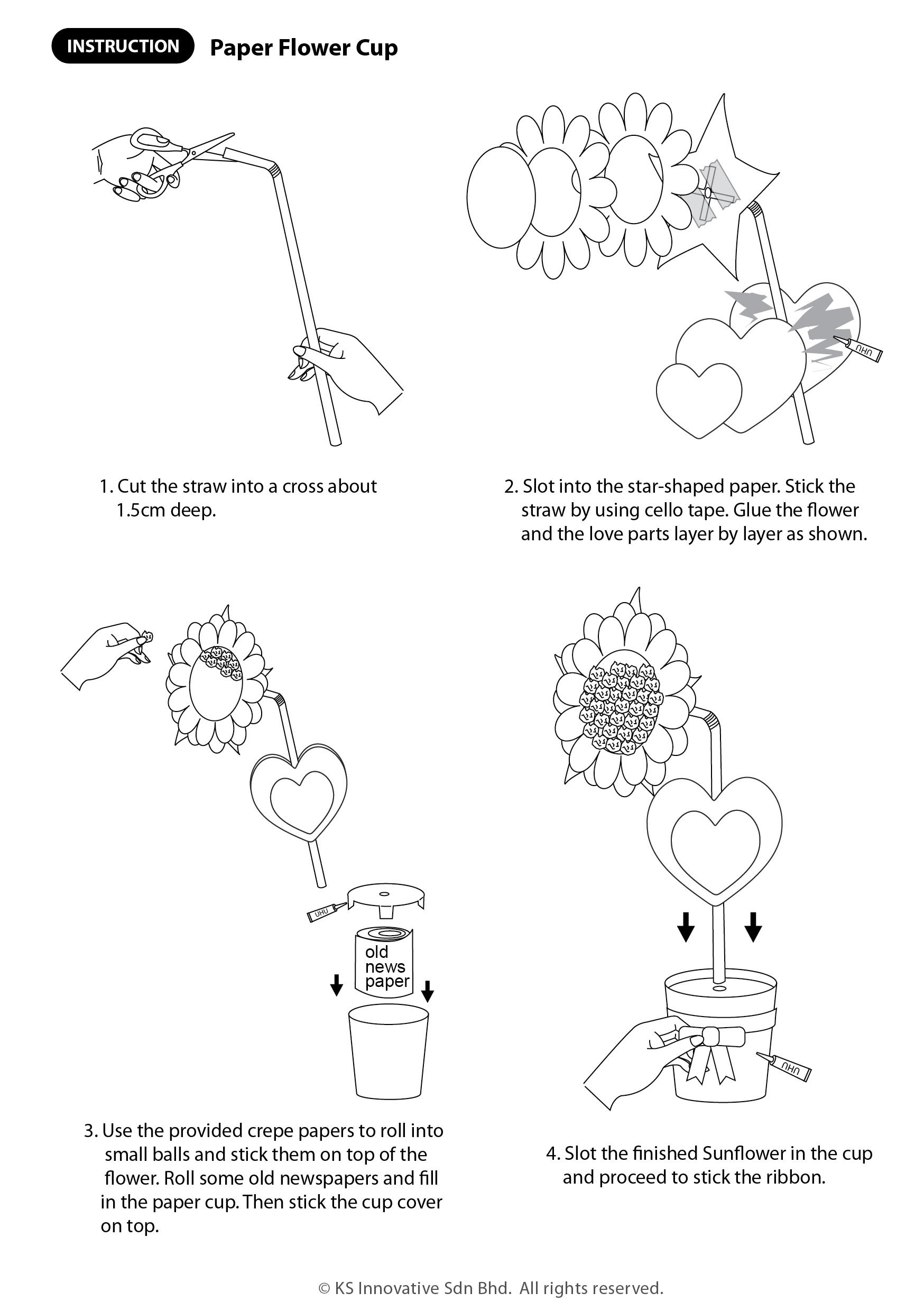 Transform paper cups into lovely DIY Sunflower pots and make someone smile! Great for Mother's Day, Father's Day, Valentine's or Teacher's Day. The colour papers are pre-cut, kids will learn to stick and write messages on the heart shaped card. Tie a ribbon for that extra sweetness.