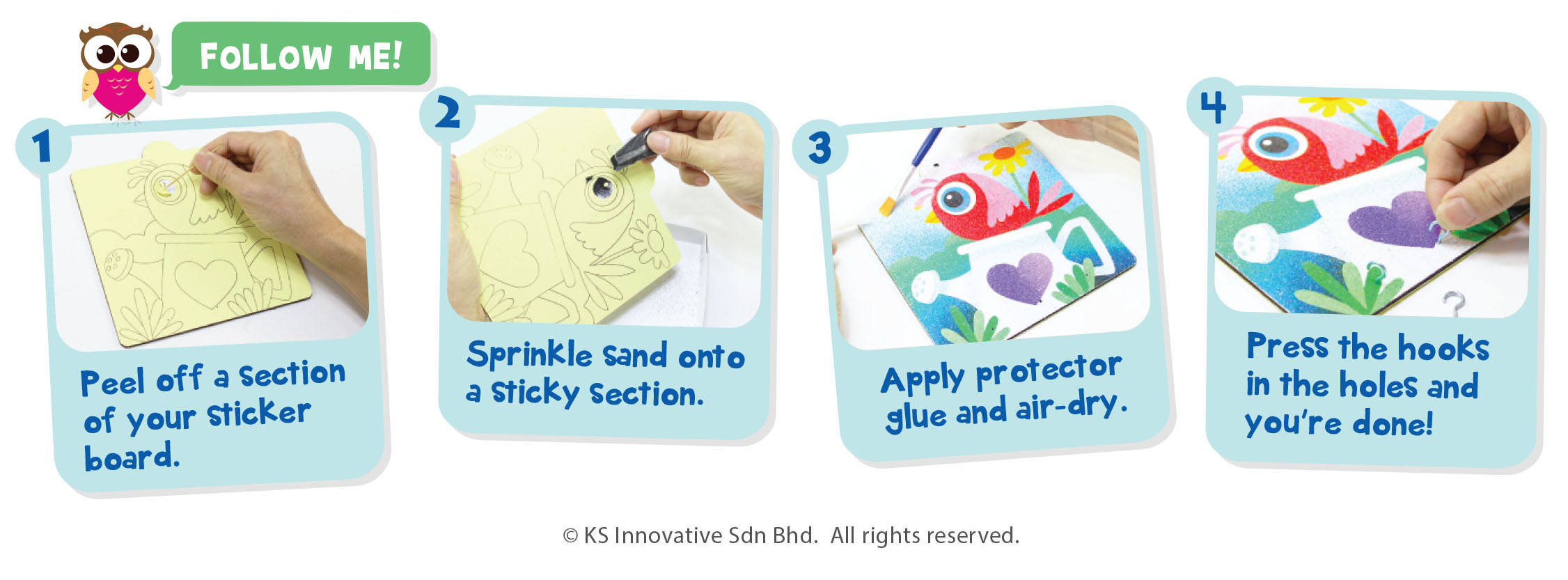 Our very creative and cute Sand Art Key Hanger Boards keep your keys tidy so you don't have to worry about losing them! They come in various different designs and you may refer to our sand artist's colouring or colour your very own key hangers! This kit comes with everything ready, with a Sand Art tray to easily save more of your sand and sand protector glue to shield your sand art when it is complete.
