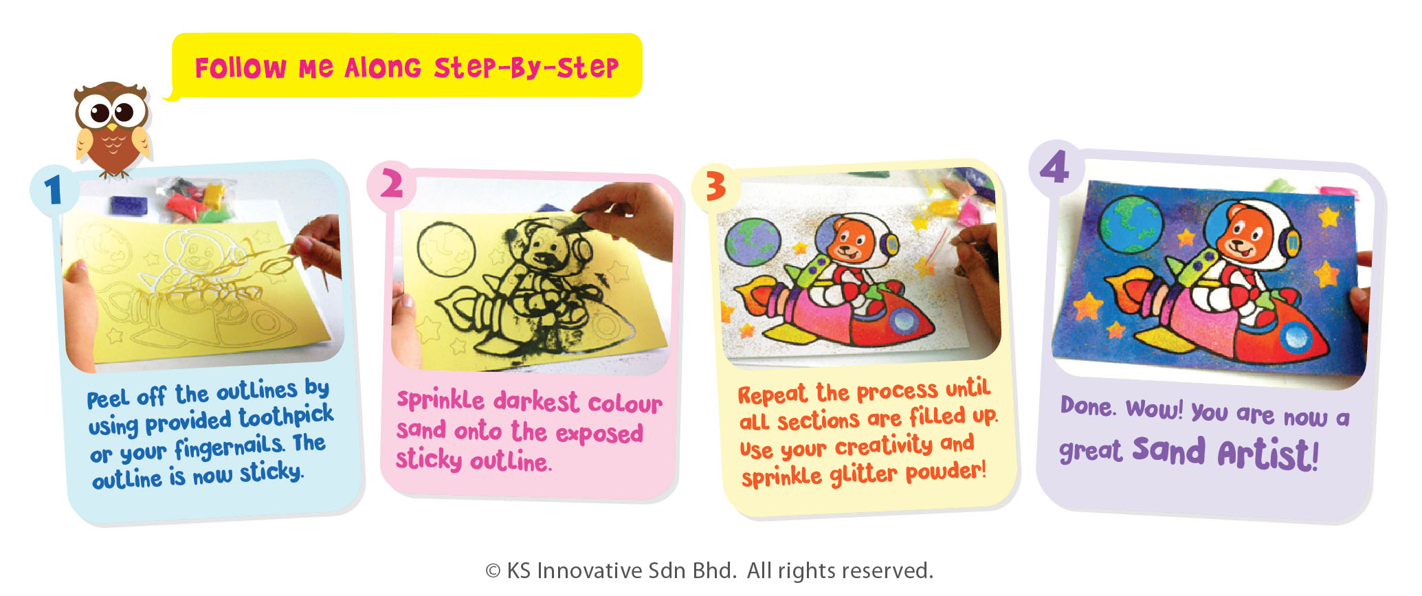 Join Astronaut Teddy Bear on an exciting outer space adventure and discover the moon and new planets. Just peel and sprinkle, no scissors required! Keep completed sand art card neatly in plastic sleeve.