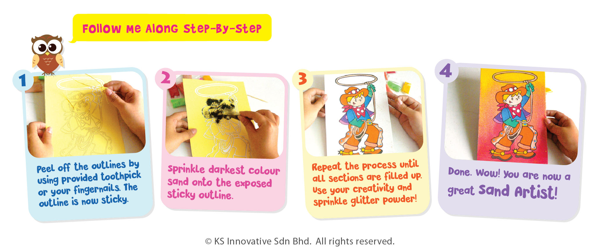 Join Cowboy and Red Indian on a wild west adventure through the Great Plains together. Just peel and sprinkle, no scissors required! Keep completed sand art card neatly in plastic sleeve.