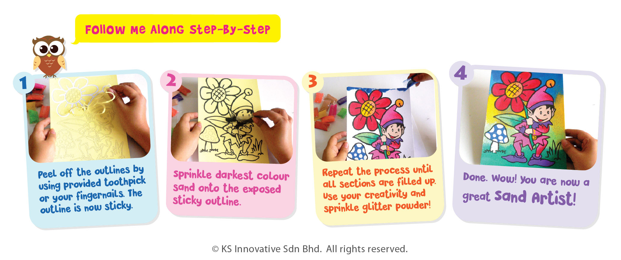 Join the adventures of Twinkle, the Elf in Merry Elf-Land as he befriends a snail, pick berries and plays with butterflies. Just peel and sprinkle, no scissors required! Keep completed sand art card neatly in plastic sleeve.