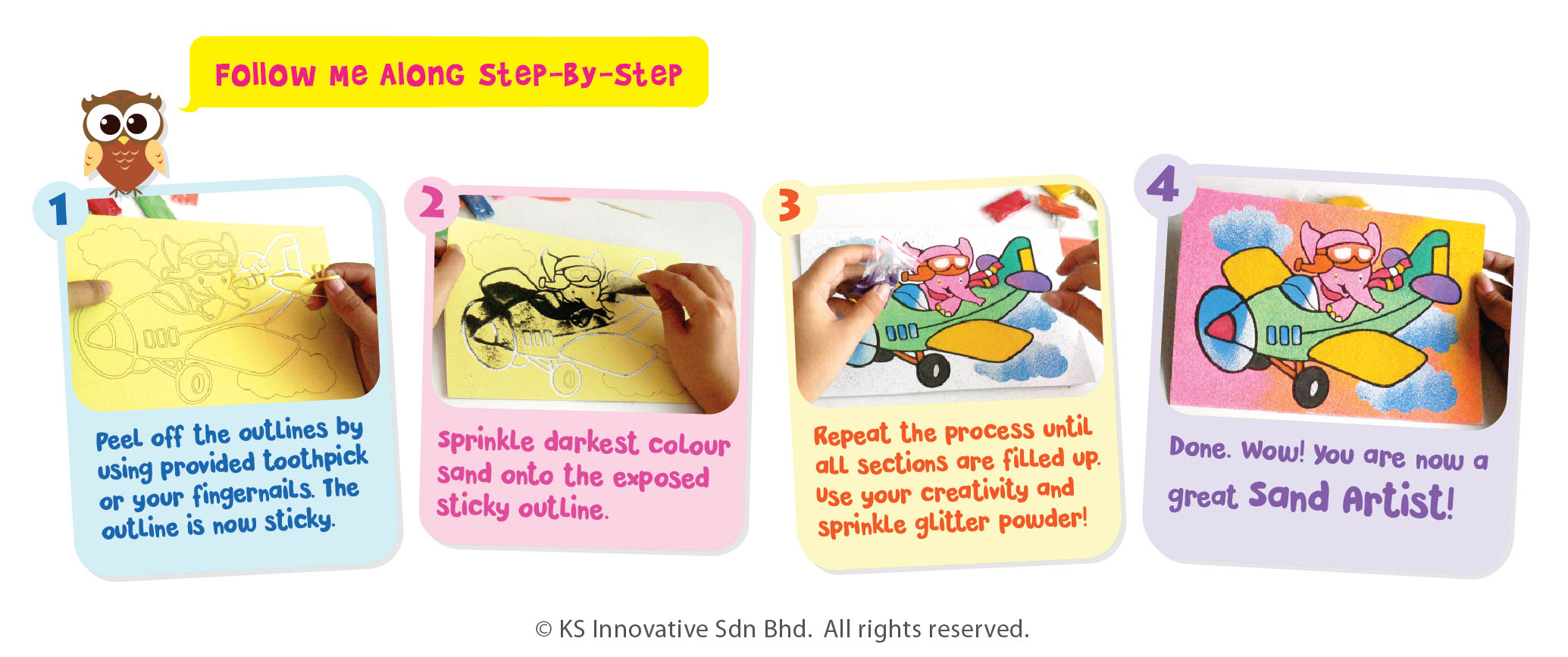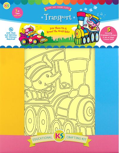 Join Mr Elephant, Mr Lion and Mr Tiger on a Round the World ride together by plane, boat, train, motorbike and racing car. Just peel and sprinkle, no scissors required! Keep completed sand art card neatly in plastic sleeve.