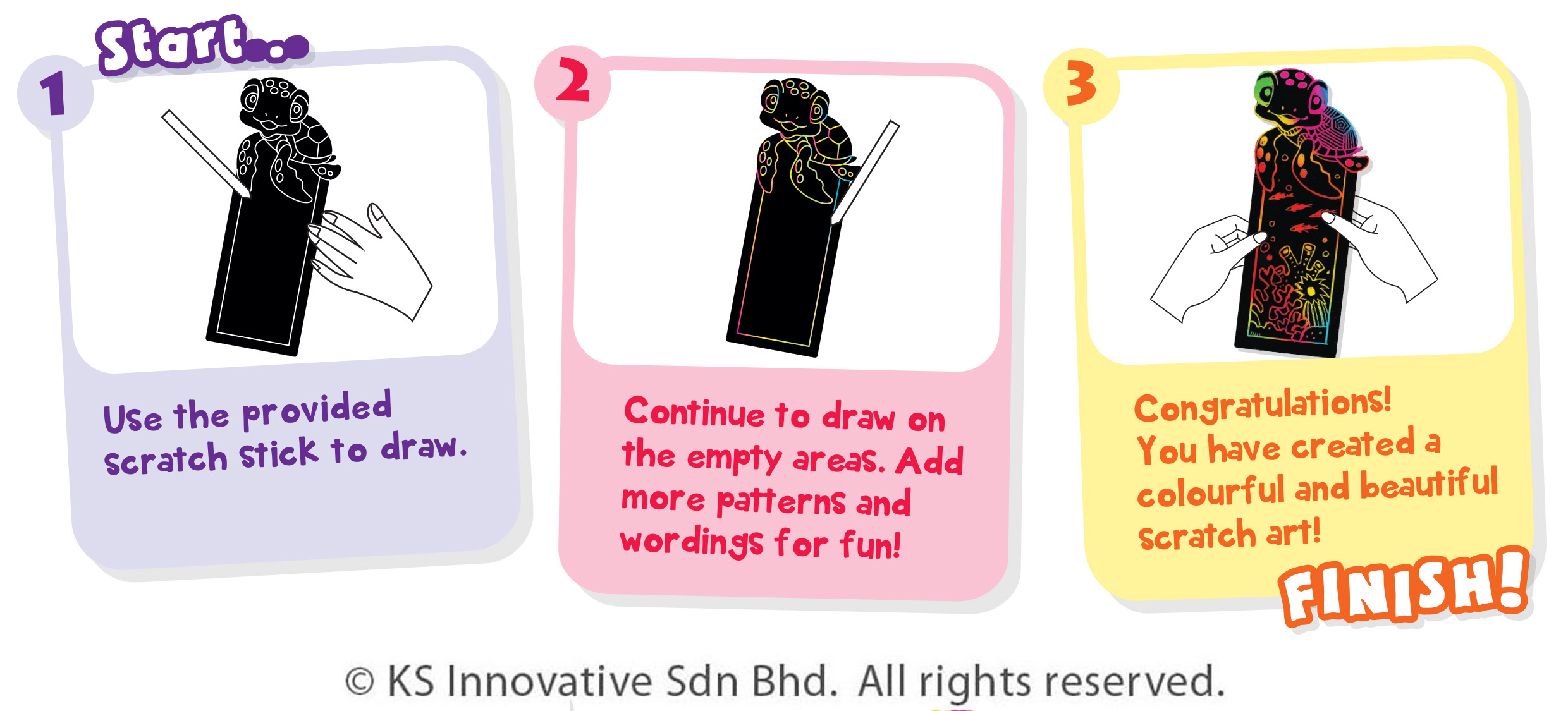 Add a splash of colour and creativity to your reading with our unique pre-printed Scratch Art Wild Life bookmarks! This kit makes 4 unique designs - Orang Utan, Proboscis Monkey, Hornbill and Sea Turtle. Each bookmark features a matte black surface that reveals vibrant rainbow colours underneath when scratched with the included scratch stick/stylus. Personalize your design, doodle, or write a message—perfect for readers, students, or as a fun DIY gift. Durable, lightweight and endlessly creative, the kit comes with everything you need! Kids will enjoy showing off their masterpiece to family and friends!
