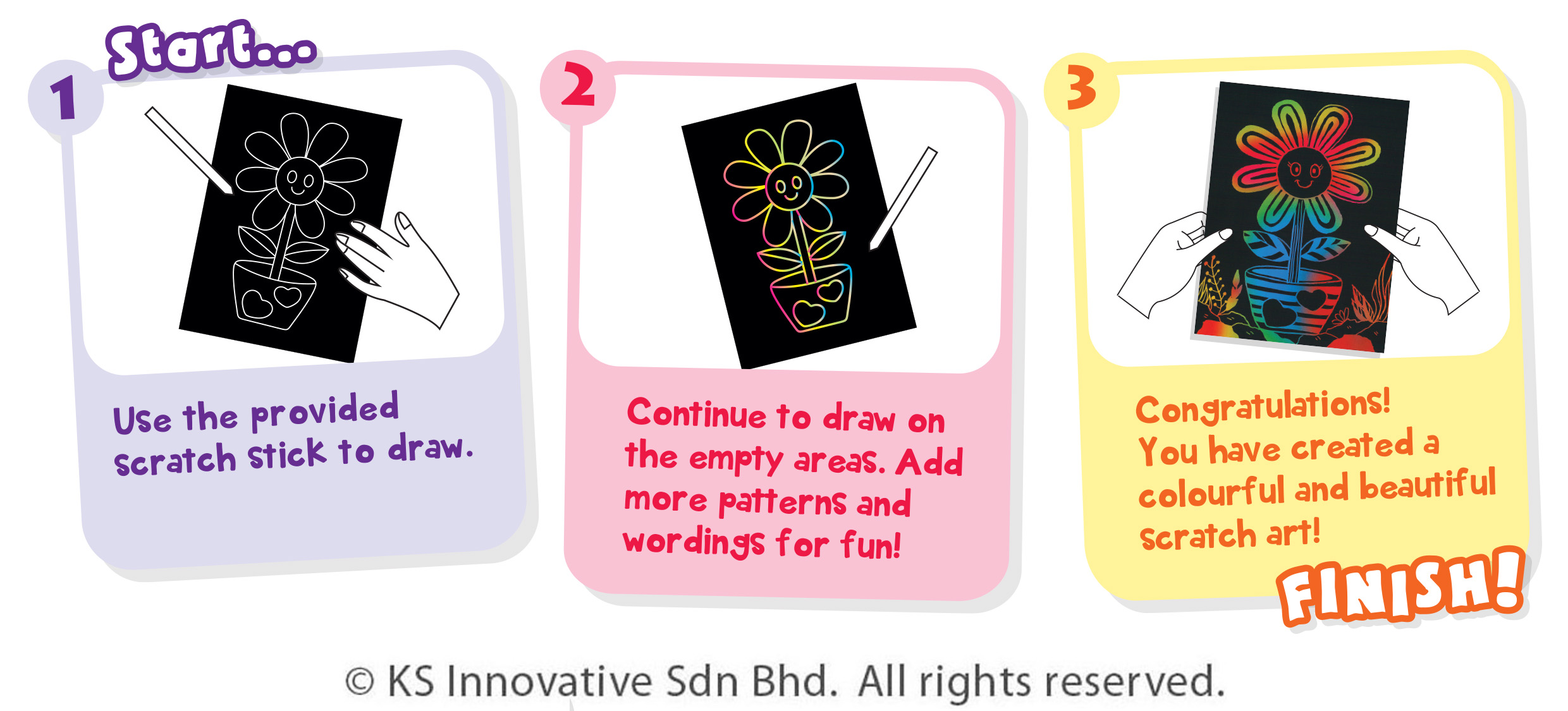 Scratch-doodle our new pre-printed Scratch Art cards in Flowers theme and see them reveal their beautiful rainbow colours underneath! This adorable Flowers theme includes 4 unique flower designs! Scratch Art is a great craft to relax by using the stylus/scratch stick to scratch away the black layer and a wonderful way to unleash kids' creativity by drawing different patterns whether geometric, dots or lines! Kids will enjoy showing off their masterpiece to family and friends!