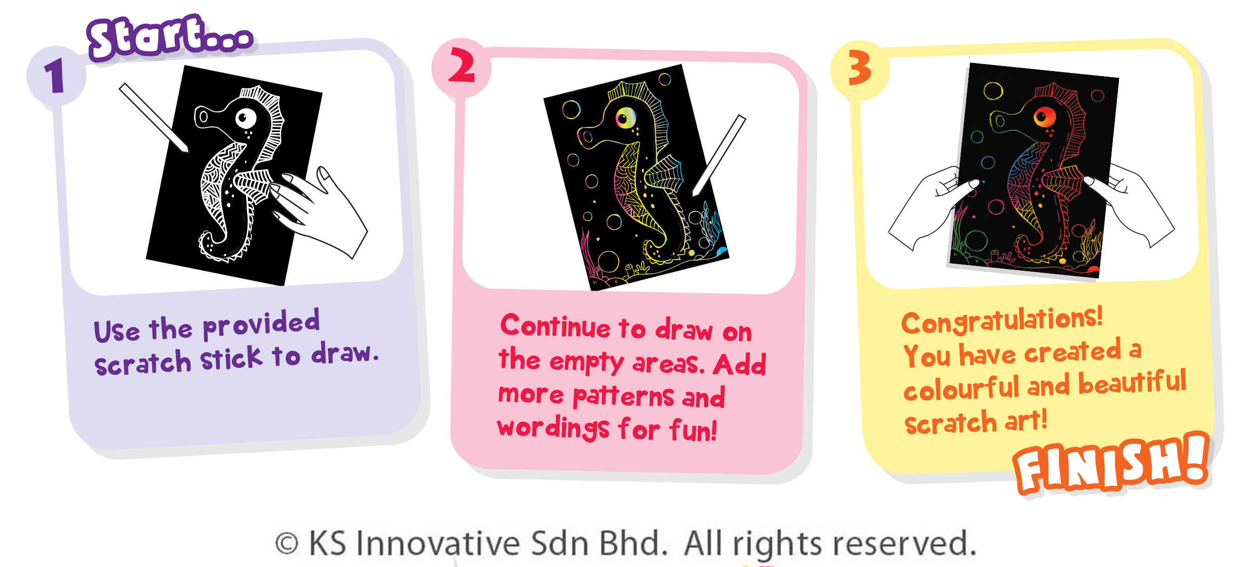 Scratch-doodle our new pre-printed Scratch Art cards in Sealife theme and see them reveal their beautiful rainbow colours underneath! This adorable Sealife theme includes Seahorse, Dolphin, Octopus and Shark. Scratch Art is a great craft to relax by using the stylus/scratch stick to scratch away the black layer and a wonderful way to unleash kids' creativity by drawing different patterns whether geometric, dots or lines! Kids will enjoy showing off their masterpiece to family and friends!