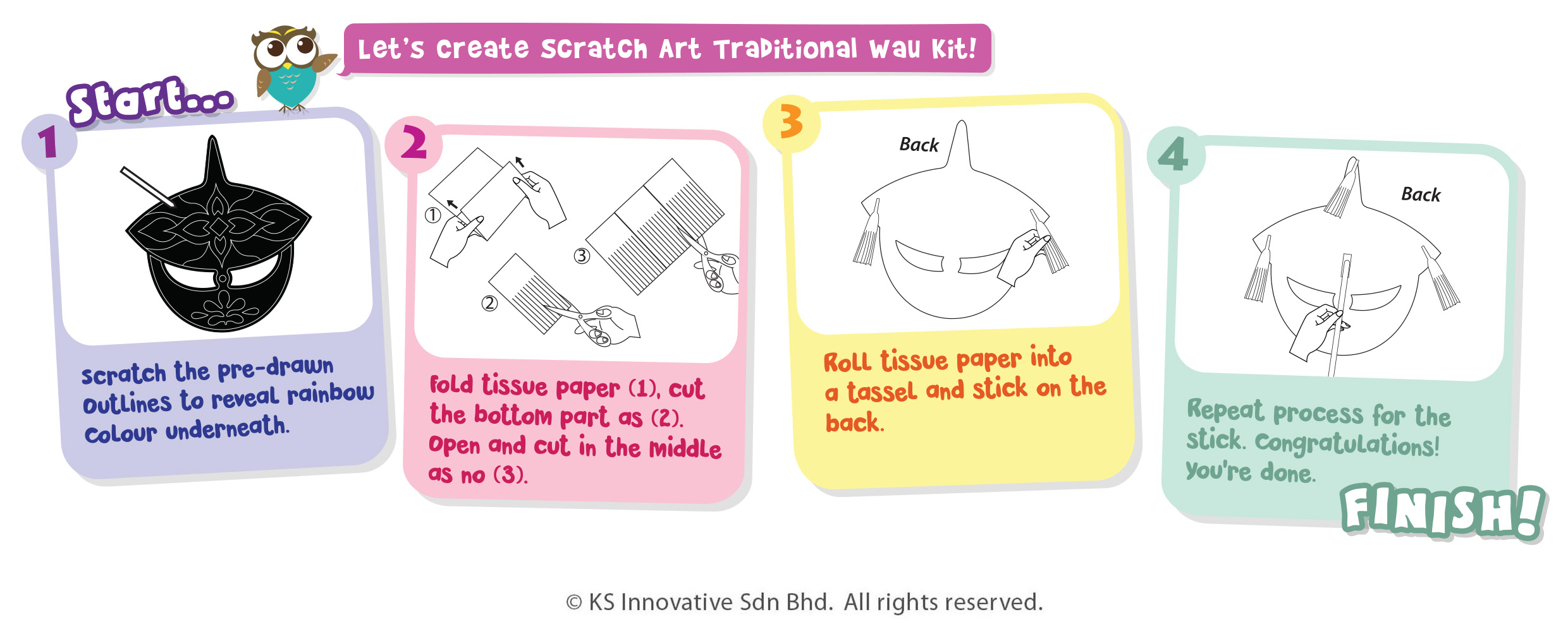 Scratch and doodle pre-cut Wau-shaped Scratch Art hand sticks that comes in 5 unique, pre-printed motifs - see them appear in rainbow colours! Wave your beautiful, culturally-inspired doodles to your friends and decorate these Wau hand sticks proudly in your home or at school! Add colourful tassels as the final touch - traditional wau craft holds cultural significance in Malaysia and serves as a symbol of national pride and identity, perfect for this Merdeka day!