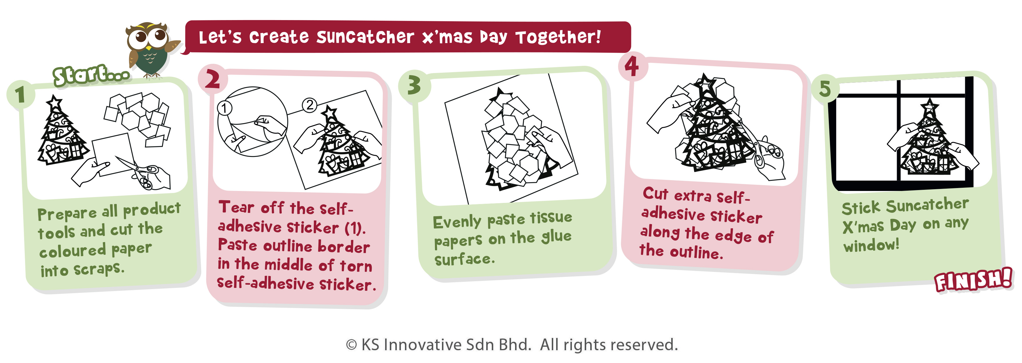 Let the sun ray shine through our mesmerizing Christmas Suncatchers bursting with colourful rays from your windows! They come in 3 different designs - Christmas Shop, Christmas Tree and Christmas Star. These stained glass effect self-adhesive craft displays nicely on windows and letting the sun shine through them makes the reflective light all the more colourful and interesting! Create the colourful effect by pasting coloured paper on top of each other. Scissors is needed to cut each shape out.