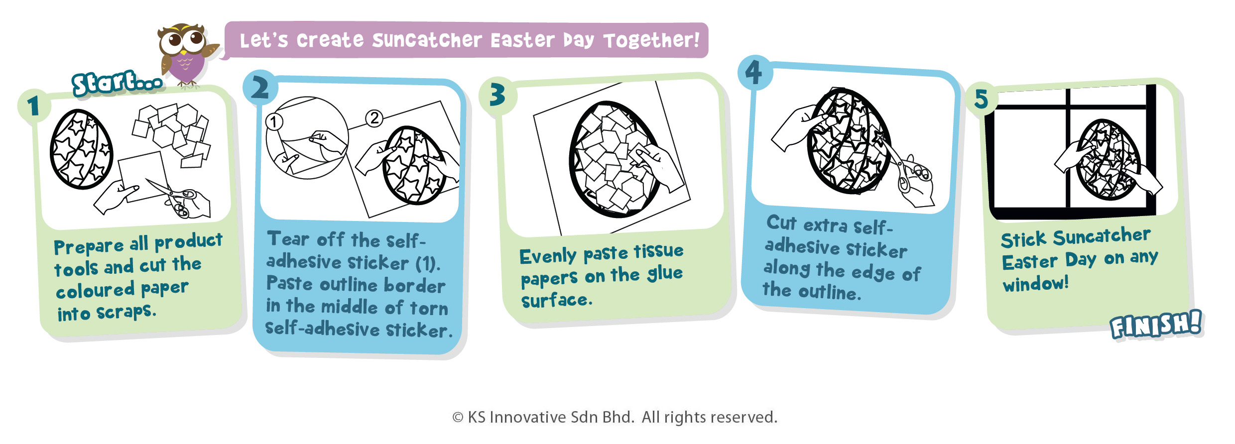 Let the sun ray shine through our adorable Easter Suncatchers bursting with colourful rays from your windows! They come in 3 different designs - Bunny Easter Egg, Easter Egg Basket and Stars Easter Egg. These stained glass effect self-adhesive craft displays nicely on windows and letting the sun shine through them makes the reflective light all the more colourful and interesting! Create the colourful effect by pasting coloured paper on top of each other. Scissors is needed to cut each shape out.
