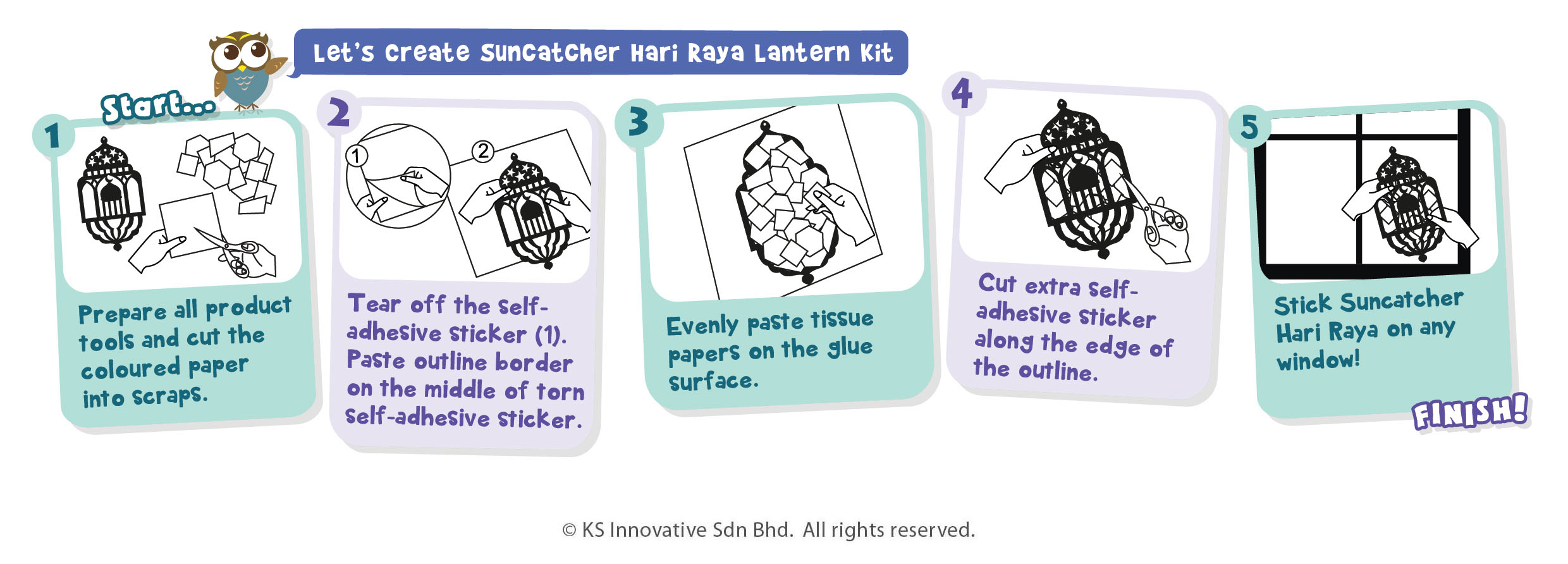 Celebrate this joyous Raya by displaying beautiful Suncatcher Raya lanterns! Our designs include elegant Mosque shape and stars in the background, how wonderful to look at when these stained glass effect self-adhesive craft sits nicely on windows and letting the sun shine through them makes the reflective light all the more colourful and interesting! Create the colourful effect by pasting coloured paper on top of each other. Scissors is needed to cut each shape out.