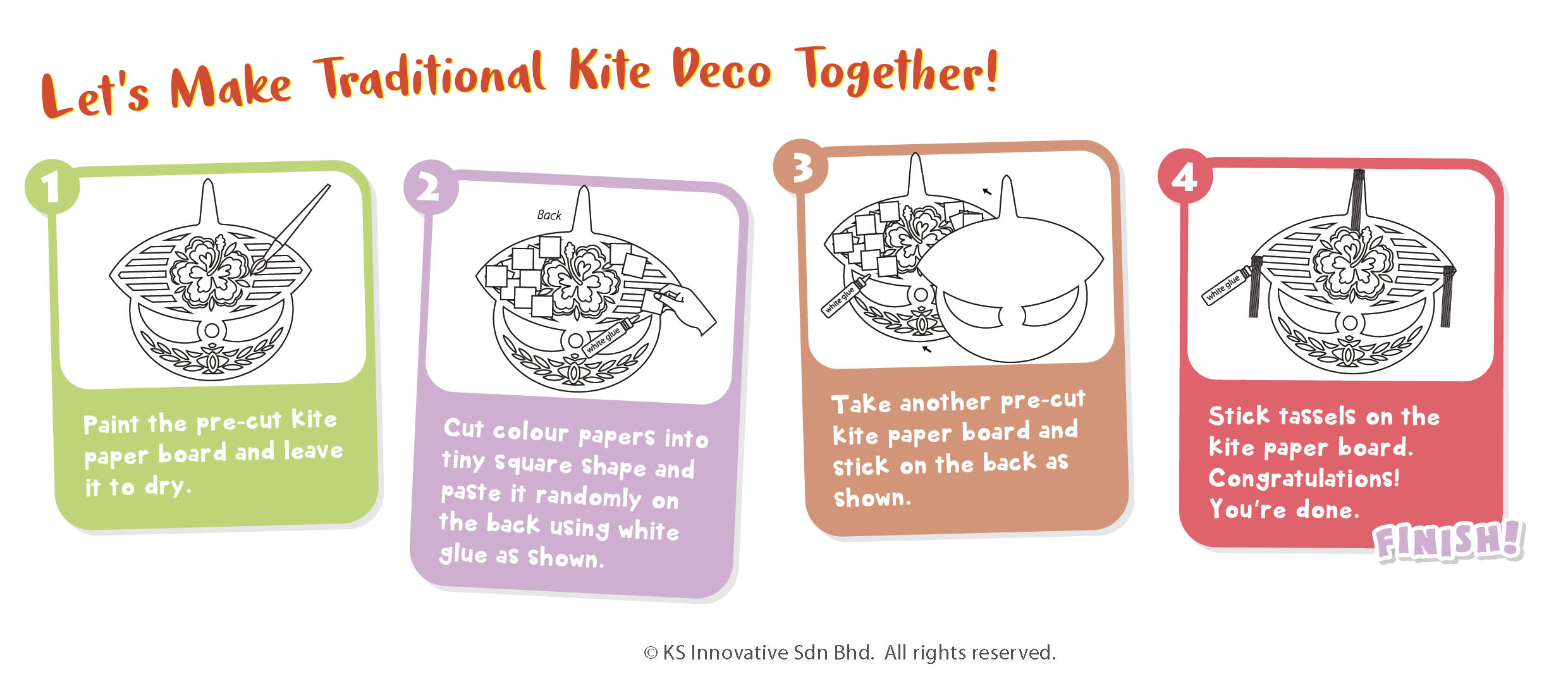 Design and decorate a vibrant and elegant cultural craft, called Wau, which is a traditional paper kite in Malaysia! Featuring the Hibiscus flower motif and wonderful, geometric pattern in a pre-cut paper board. Kids will enjoy learning with their hand motor skills to cut, arrange and paste colour papers and show off the kaleidoscope of colours behind the wau silhoutte. Add shiny tassels as the final touch! Traditional wau craft holds cultural significance in Malaysia and serves as a symbol of national pride and identity, perfect for this Merdeka day!