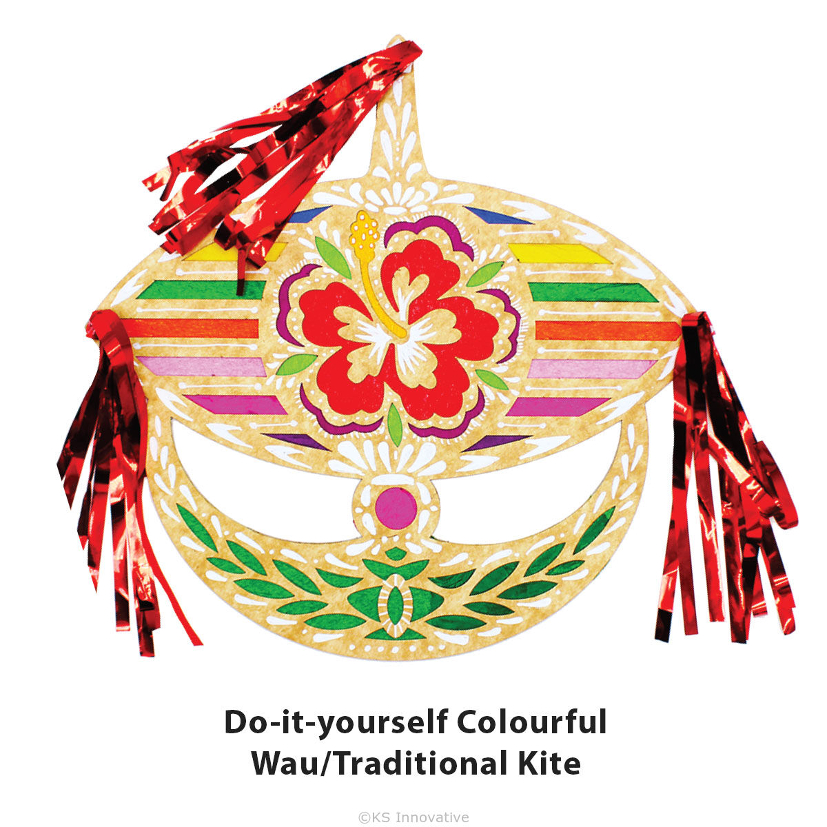 Design and decorate a vibrant and elegant cultural craft, called Wau, which is a traditional paper kite in Malaysia! Featuring the Hibiscus flower motif and wonderful, geometric pattern in a pre-cut paper board. Kids will enjoy learning with their hand motor skills to cut, arrange and paste colour papers and show off the kaleidoscope of colours behind the wau silhoutte. Add shiny tassels as the final touch! Traditional wau craft holds cultural significance in Malaysia and serves as a symbol of national pride and identity, perfect for this Merdeka day!