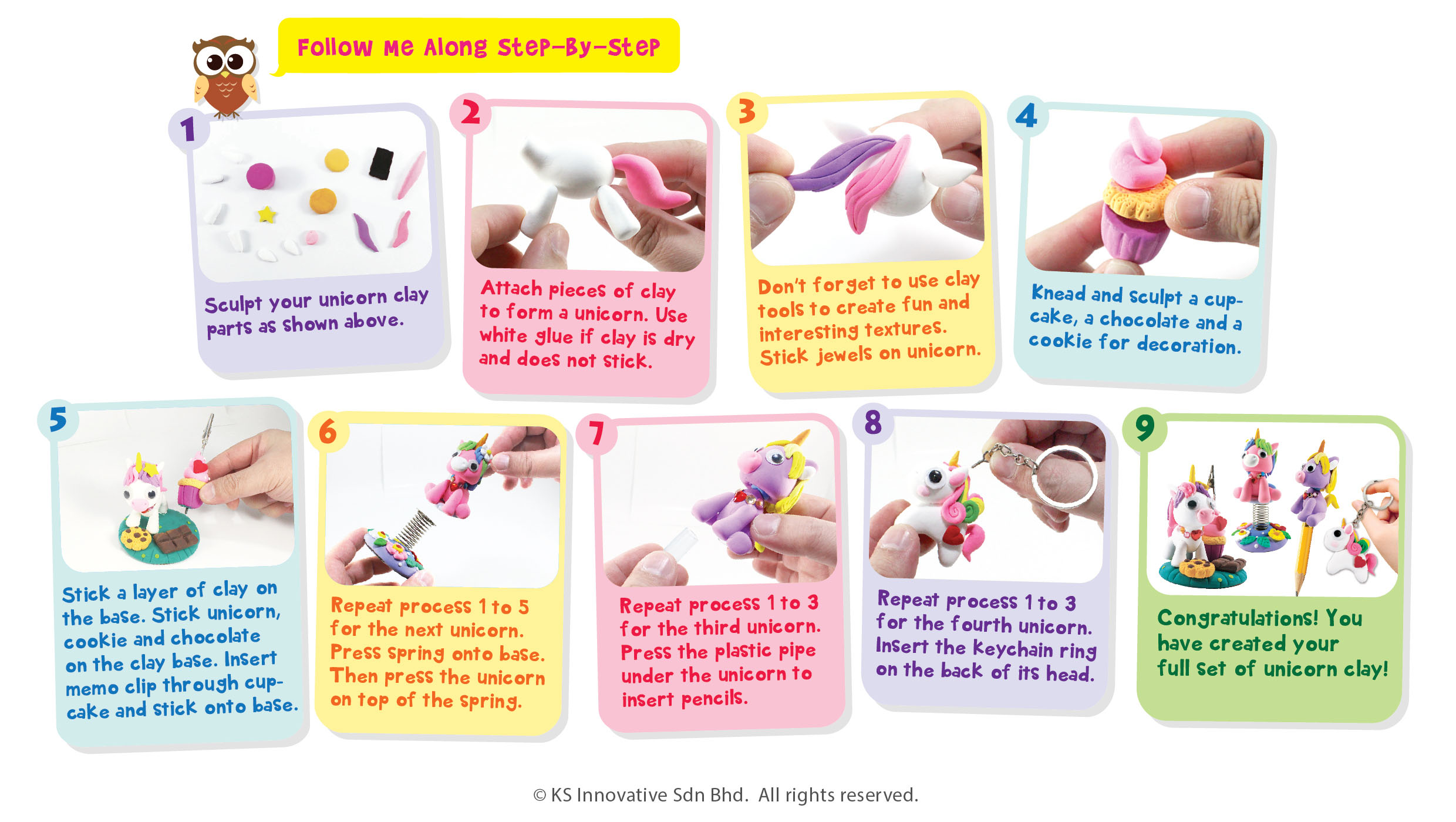 Sculpt 4 different Air-Dry Clay Unicorns in the form of Memo Holder, Bobble Spring, Pencil Topper and Keychain with instructions on how to build them from scratch. Air-Dry Clay is a lightweight clay made specially for kids' craft. The kids will adore rolling, squeezing, twirling, and pulling Air-Dry Clay into 3D shapes. Add special decorations with jewel stickers and wiggly eyes at the end!