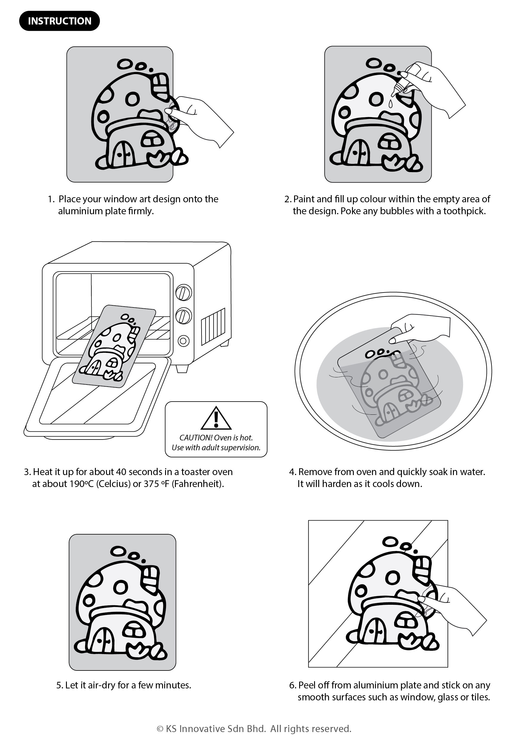 Transform your windows and glass panels into stunning creative scenes! You may choose designs separately and get our Window Art colours to start painting! Our Window Art colour is opaque and needs a baking process with adult supervision. An aluminium plate is also required.