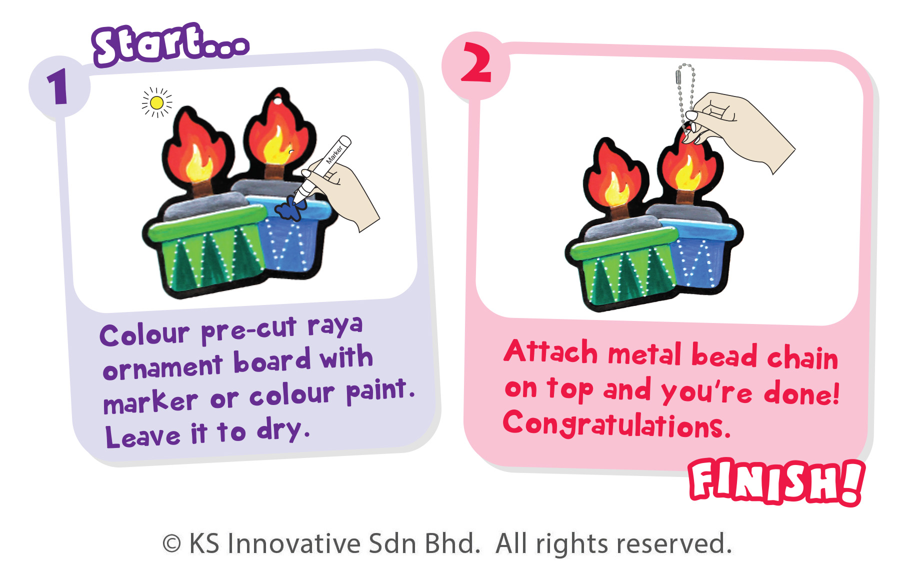 - 12 Charming Festive Designs: Meet charming Ketupat, glowing Pelita lamp, twinkly Crescent Moon & Star, cute Oil Lamp, musical Malay drum, happy Raya Malay boy and girl, Mosque Silhouette, cosy Prayer Mat, surprise Duit Raya Packet, lush Raya floral ring and delicious dates – all pre-cut with merry outlines just begging for your colourful sparkle!